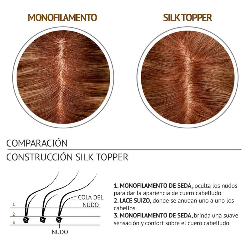 Andrea es una pieza especialmente diseñada para personas en tratamientos médicos o con alopecia. Su parte superior es un Monofilamento, donde se anudan las hebras de cabello una a una, para simular el cuero cabelludo y que te permite peinarte en cualquier dirección. La parte de atrás son tiras de cabello sostenidas por un marco de encajes elásticos, lo que hace que se ajuste a tu cabeza. El cabello es 100% humano y remy, siempre suave y sedoso.
